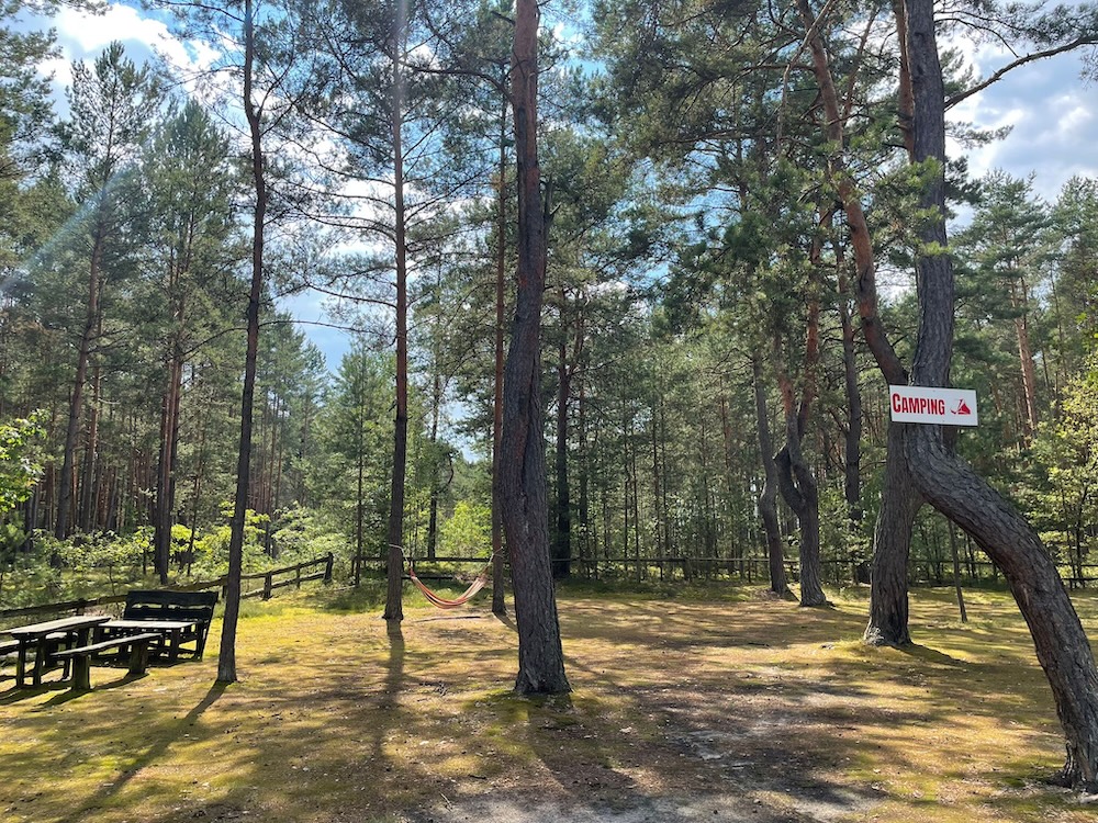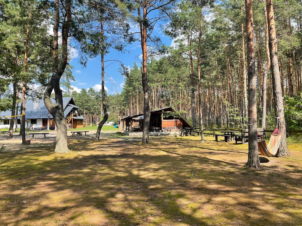 Kameralne pole namiotowe w lesie zapewnia cień w słoneczne dni. Dla użytkowników przygotowane są sanitariaty zewnętrzne z ciepłą wodą a także stoły i ławy. Pod dużą zadaszoną wiatą znajdziesz też lodówkę i czajnik elektryczny.